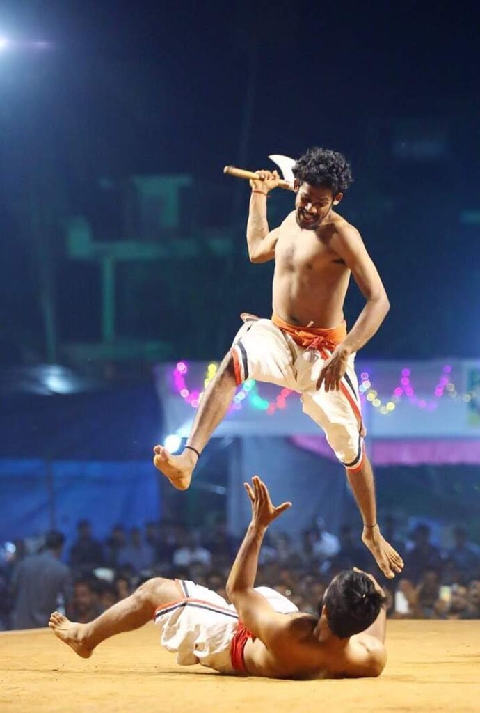 An Ankam is held in an arena called “Ankathattu”. The rulers who represented the warriors, along with their courtiers and servants would be watching the event with much enthusiasm apart from the local people also assembled in large numbers to watch this rare event. At the end of the Ankam, the defeated warrior getting killed was considered normal!